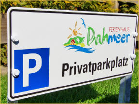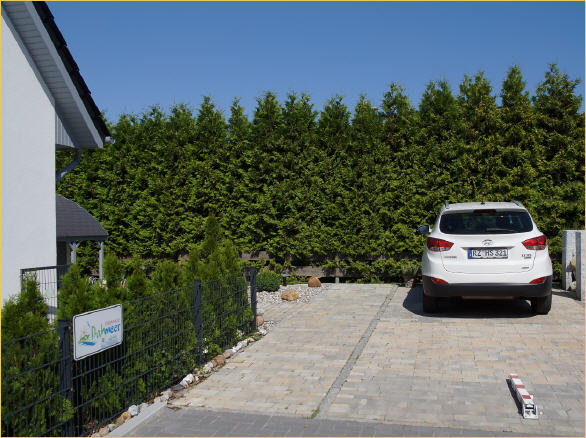 Zwei hintereinander angeordnete PKW-Stellplätze befinden sich am Ferienhaus (verlängerte Stellfläche). Die gepflastere Fläche hat eine Länge von 9,70 Metern. Dazu kommen als Verlängerung rd. 2 Meter Rasengittersteinfläche.