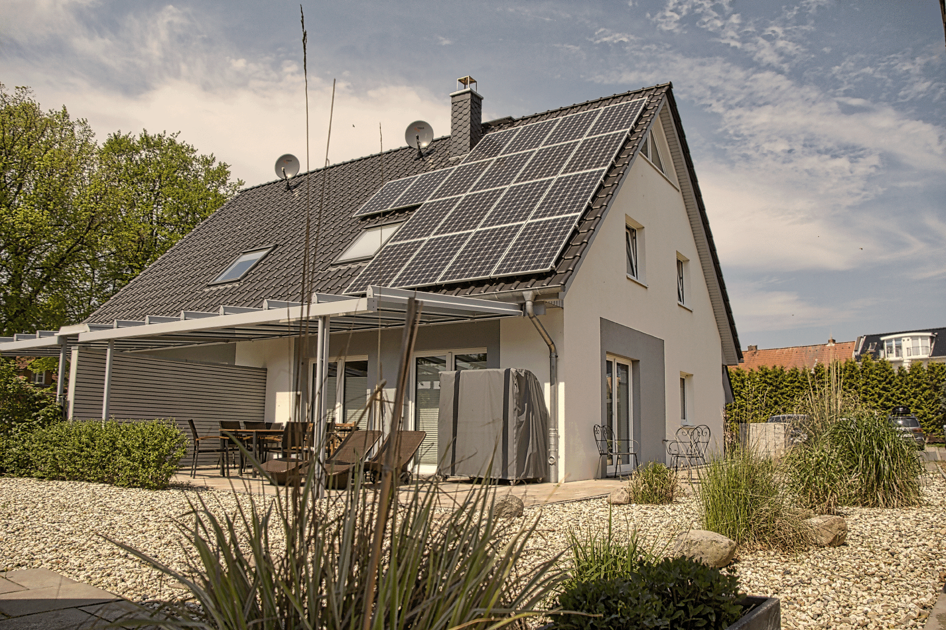 Außenbereich: nicht umzäunter Garten, 2 Terrassen, Gartenhaus und 2 PKW-Stellplätze